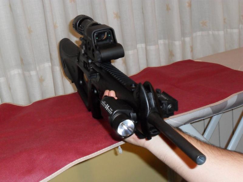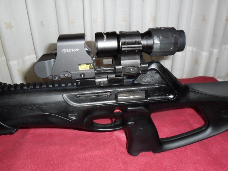 A parte, le he puesto un Visor Sightmark 5x Magnificador STS, para el Eotech. La verdad es que funciona de maravilla, el poder desplazar aun lado el magnificador y dejar el Eotech solo, o poner el magnificador de 5 aumentos y obtener una mira telescópica. Falta probarla en el campo de tiro.