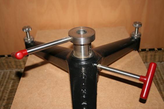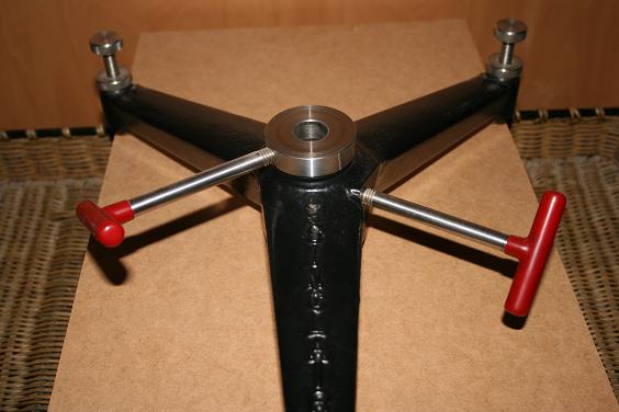 En el centro de las tres patas, la torre tiene el agujero para un cilindro que a su vez tiene un eje en su parte superior por donde entra la raíz central del cabezal. Con el cilindro se hace el control grueso de altura.