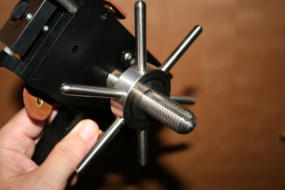 Para cambio de cabezal, tan sencillo como aflojar la manivela de la izquierda y extraerlo; se mete el otro cuidando que esté perfectamente encarado para que la punta de la rosca entre en el rebaje correspondiente y ya está. Se aprieta a la altura necesaria.