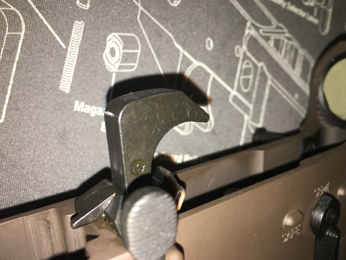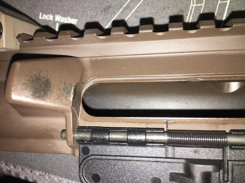 Detalle de lo que comentaba antes, para que no se pase de tolerancias y no quepan las piezas, no lleva en los laterales cerakote. Eso otros fabricantes no lo hacen, y separar el lower del upper cuesta Dios y ayuda, sin contar que se mete una tension lateral al lower desde el interior que no le beneficia en absoluto, ya que lo suyo es que las paredes en las que se apoya el disparador tengan las menos cargas estructurales posibles.