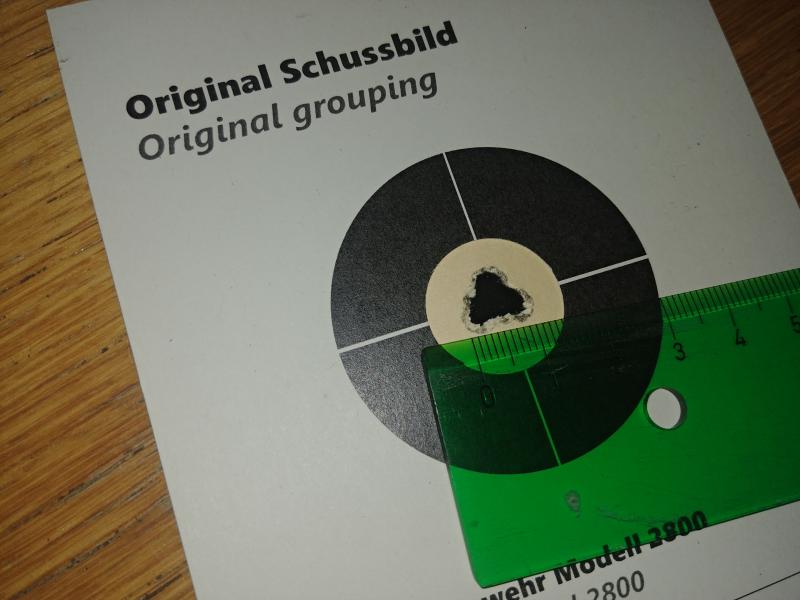 Bueno pues ahi va la agrupación de fábrica (no se cuantos disparos de prueba hacen) y otro mio de 5 disparos sobre un blanco de carabina de aire comprimido puesto a 50m.