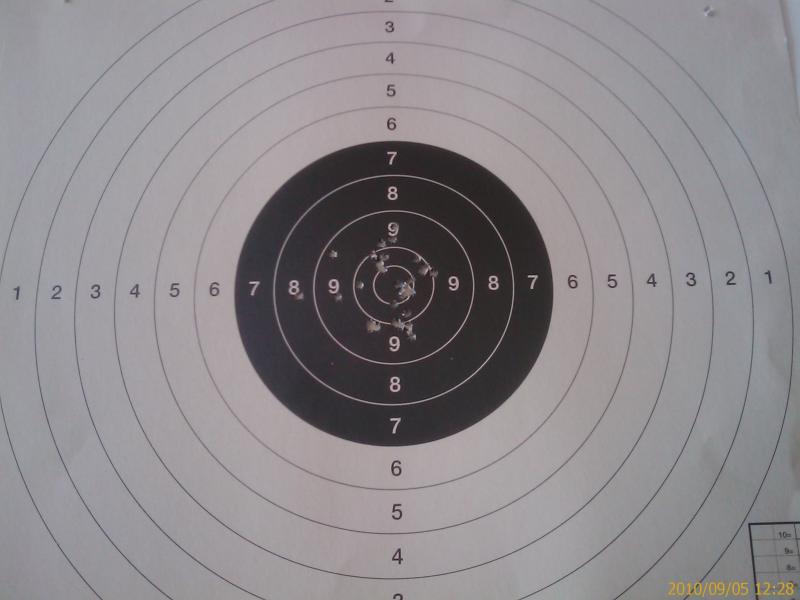 y mucho mejor, como pondreis ver en las fotos ke pongo los disparos son a 50 metros, miras abiertas, apoyado y en los primeros disparos, como todavia no puedo graduar el arma a 50 metros a pie, he ido probando de mover por el alza, el primer disparo a alza 50 un 7 a las 11horas.