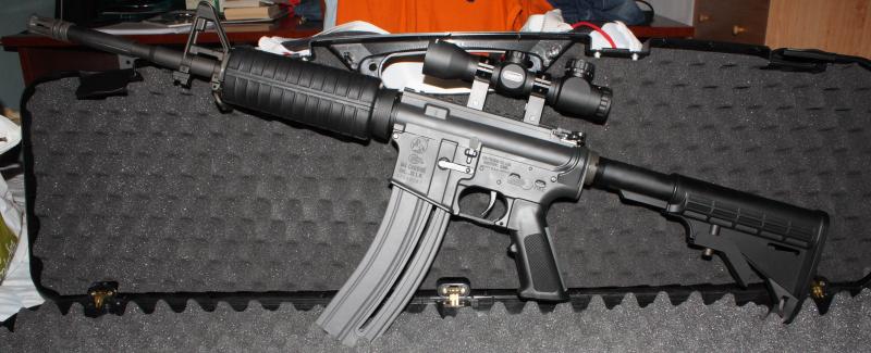 buenas a todos de nuevo,bueno ya tengo mi m4 desde el martes,ya van unos 100 tiros de los cuales al montar dos veces el arma la bala no entro bien,creo que fue culpa mia por el arma estaba muy torcida hoy estado tirando otra vez para ver que pasa y ningun problema,la verdad que muy contento,aqui pongo una fotito para que la veais,ahora mismo le acabo de poner un visor leapers 4x32 no es gran cosa pero bueno.