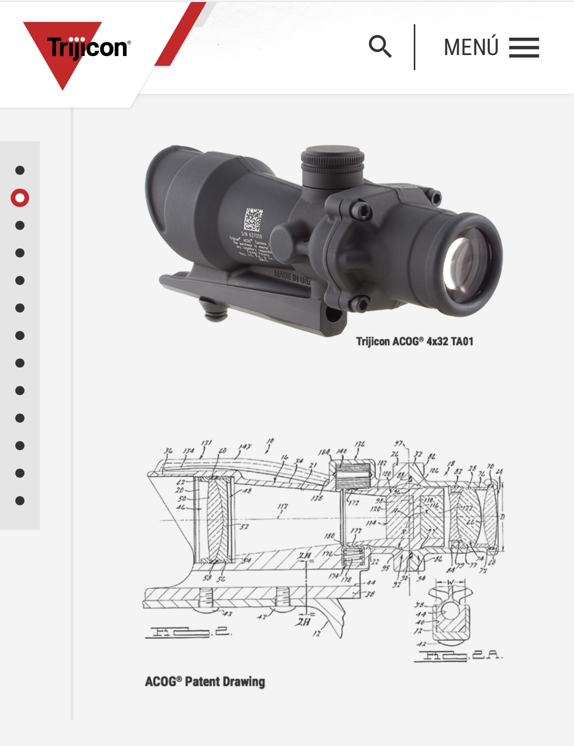 -Visor de punto rojo Trijicon Acog 4x32 T (tritium) A01. 1/3 de pulgada (8,5 mm) por click. Sobre el Trijicon se ha instalado un punto rojo Eotech EFLX de 3 MOA, mediante base ACOG.