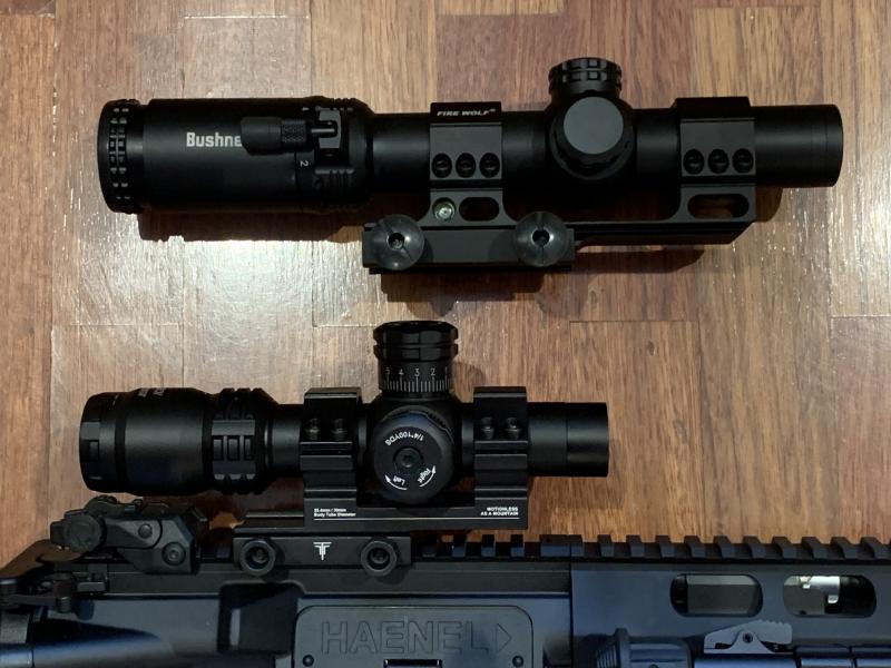 -Visor de back up March de 2-8x SFP y 1/4 de pulgada por click a 100 mts. De sólo 17,5 cm de largo, está pensado para M4s de 14” de cañón o menos. Segundo visor de back up Bushnell AR 1-8x24 SFP con tubo de 30 mm, retícula iluminada BTR1 en segundo plano focal y 26 cm de longitud. Un click = 1/10 de miliradian (1 cm). Base cantilever con burbuja de canteo horizontal e inclinómetro.