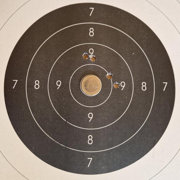 Y la diana con el resultado final. Los dos impactos que aparecen a la derecha fueron los primeros con la nueva diana (no disparé mas porque me parecieron lo suficientemente agrupados para corregir). Lo mismo sucedió con los dos siguientes, que quedaron exactamente donde quería (Poder disparar hasta 150 metros sin tener en cuentas caídas). Se que para medir agrupaciones se utilizan al menos tres pero vistos los resultados creo que tiene una magnifica precisión.