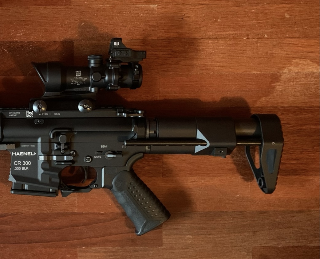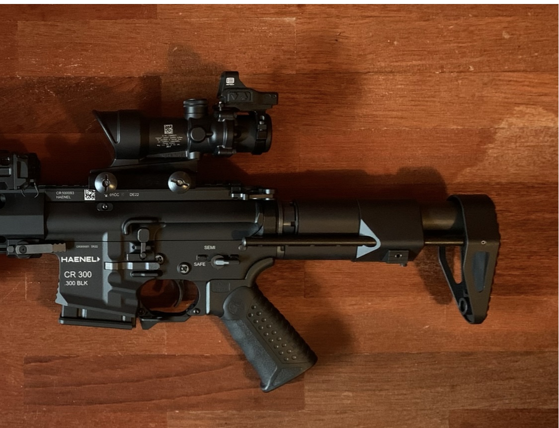 Esa culata wanna be PDW con tubo buffer completo de AR no le pega a un Haenel, tienes culatas PDW con buffers y tubos buffer reducidos que funcionan a la perfección con .300 BLK de piston, la verdad es que plegada duele un poquito a los ojos en un arma así.