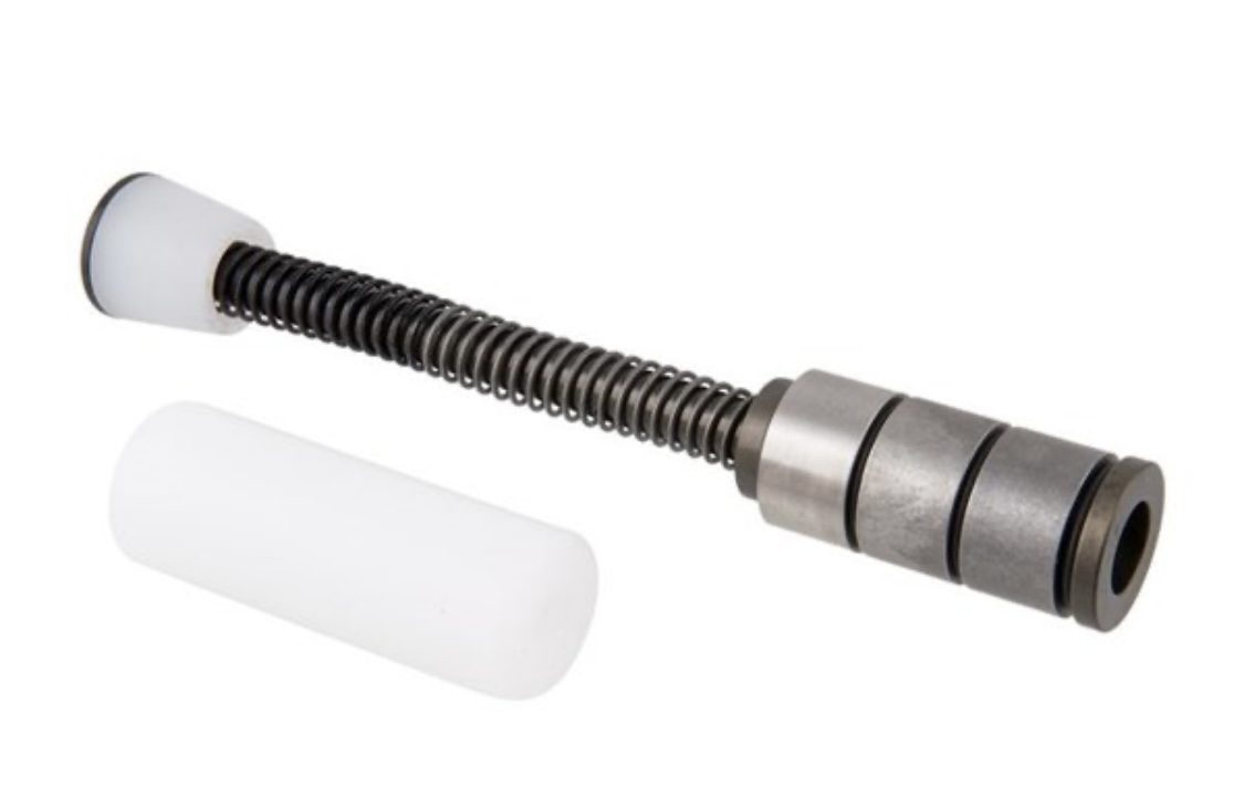 El tubo de la culata, de medida estándar, lleva en su interior un (magnífico) buffer JP Silent Capture de longitud también estándar. Va provisto de muelle guiado mediante varilla para reducir vibraciones, aumentar con ello la precisión y, de paso, minimizar el ruido del resorte original contra las paredes del cilindro durante la compresión/extensión. Lleva tres contrapesos, dos de tungsteno y uno de acero, para llegar al nivel H (heavy) 2 y 4,7 onzas de peso a nivel de cabezal, logrando con ello un ciclado más tranquilo, suave y de menor retroceso apreciable. Se le quitó el casquillo semicónico de goma de la base de la varilla, pues desviaba a esta última cuando era golpeado por el buffer durante el retroceso.