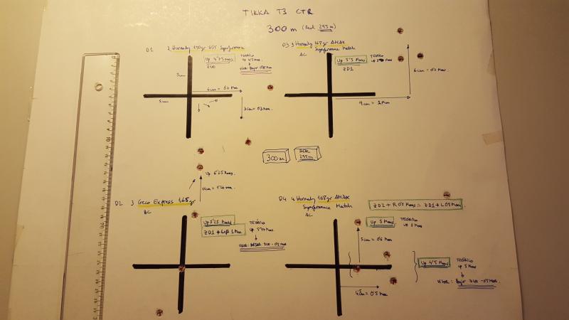 Tiré a 4 dianas, en forma de cruz, como se ve en la foto que adjunto, con tres municiones diferentes del 308WIN.