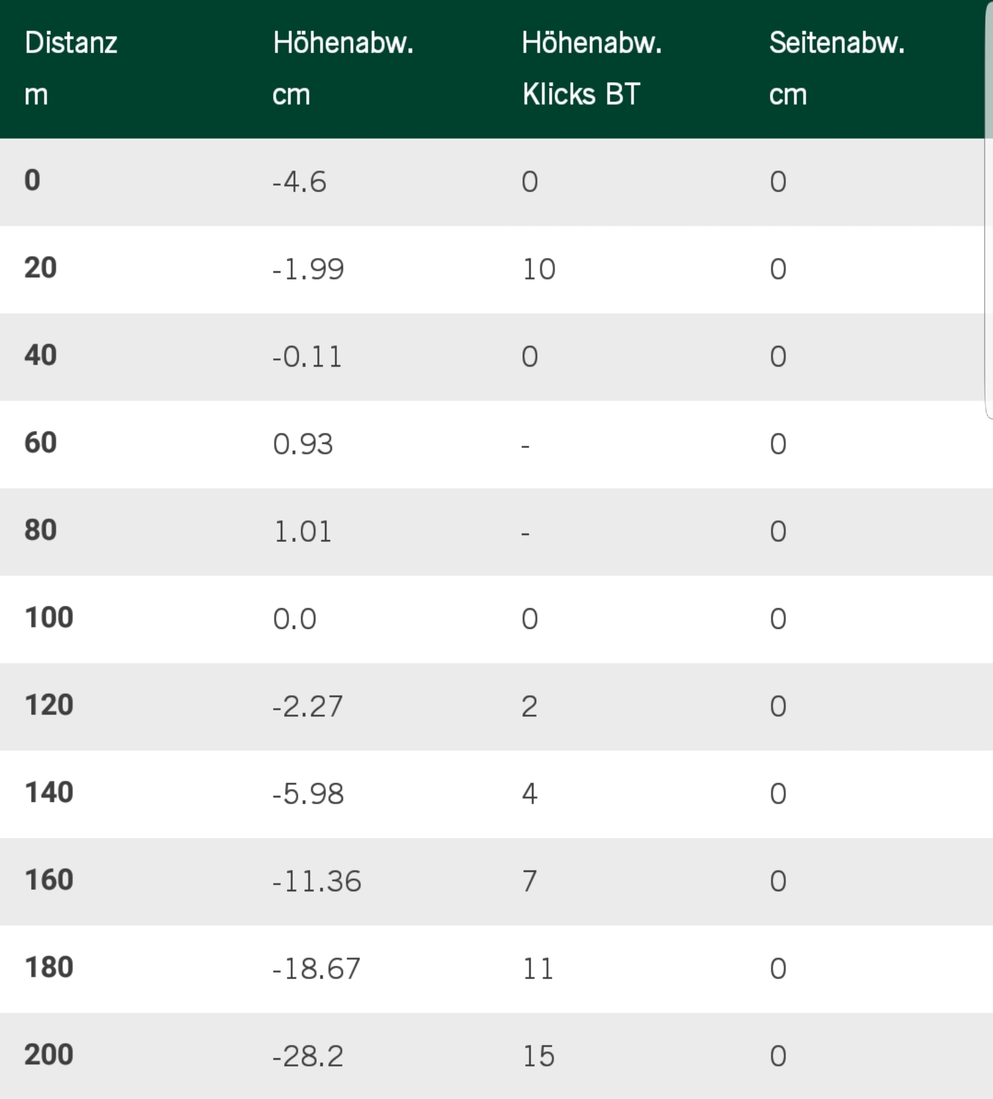 Hola quería preguntaros si a alguien le ha pasado esto con dos calculadoras balísticas diferentes pero metiendo los mismos datos. Os adjunto las dos tablas resultado de cada calculadora.