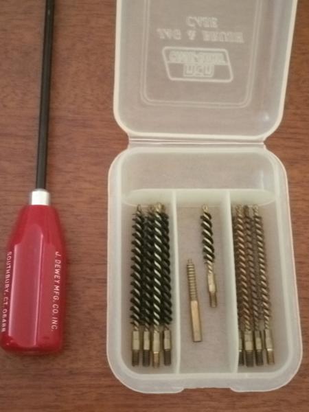 Yo para las carabinas me arreglo con una baqueta de la marca Hoppes, un par de gratas de bronce, un pasatrapos, un cepillo (del tamaño de los de dientes) y aceite en spray para armas, en vez de comprar parches de limpieza puedes usar trozos de trapo.