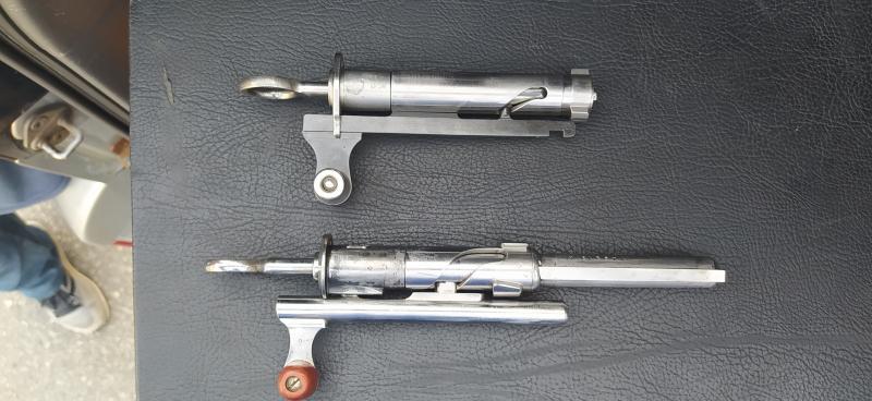 Es de abajo es el del K-11 y el de arriba el del K-31. El sistema de acerrojado es básicamente el mismo. Observa esa guía espiral en el cuerpo central de ambos. Es la pieza longitudinal la que hace girar el cerrojo al obligarlo por efecto del pie que se inserta en ella.