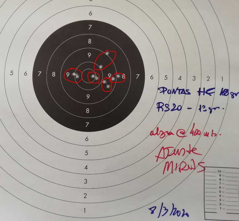 Primera tanda, cañon frio, los dos nueves de arriba. Despues cuatro tandas mas de dos tiros cada una empezando por los dos nueves de más a la derecha, luego los dos nueves de al lado a la izquierda, los dos dieces de la derecha y, por último, los dos dieces de la iquierda. Ese fue mi ultimo ajuste amtes de que se terminara la munición. Me pasé un poco con el ultimo ajuste. La distancia entre los dos ultimos tiros, centro a centro, es de 8 mm.