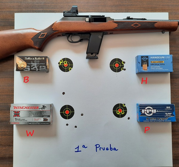 Las dos pruebas se han realizado en 20 minutos. A 25 metros. La munición B es la que mejor ha agrupado en ambos casos. Seguida por la P aunque en la primera prueba hay un gatillazo. La H agrupa bien pero ya en la primera se ve un desplazamiento a la derecha, aumentado de mucho con el arma caliente en la segunda. Es el único cartucho corto. Es decir: El conjunto del cartucho mide 275 mm, cuando los otros tres están por encima de los 290 mm. Y en último lugar esta la W con una dispersión importante en ambas pruebas. Cargador con 5 tiros, uno perdido en la primera prueba y cargador con tres tiros en la segunda.