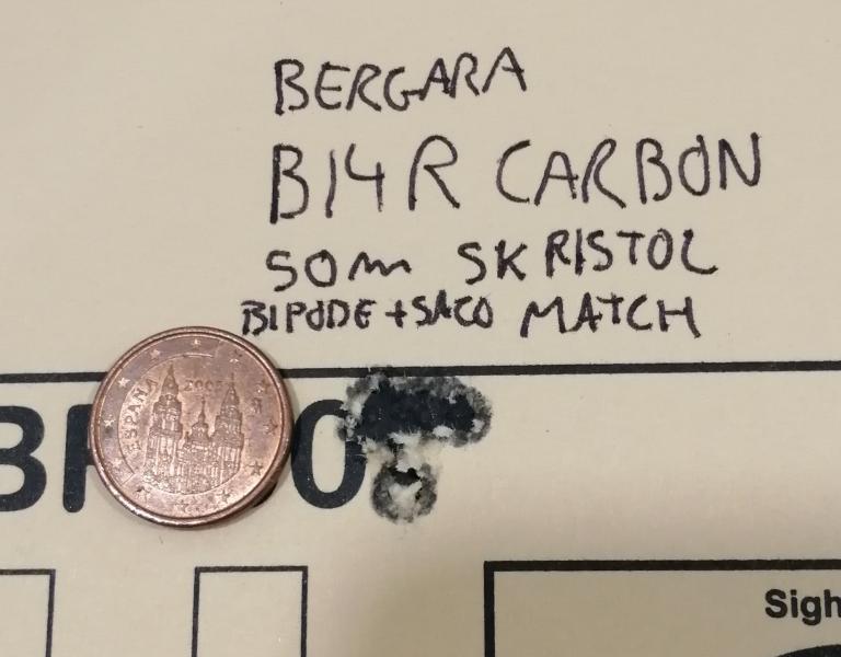 bipode delante y saco trasero, en banco, a 50m, agrupación inferior a una moneda de céntimo.