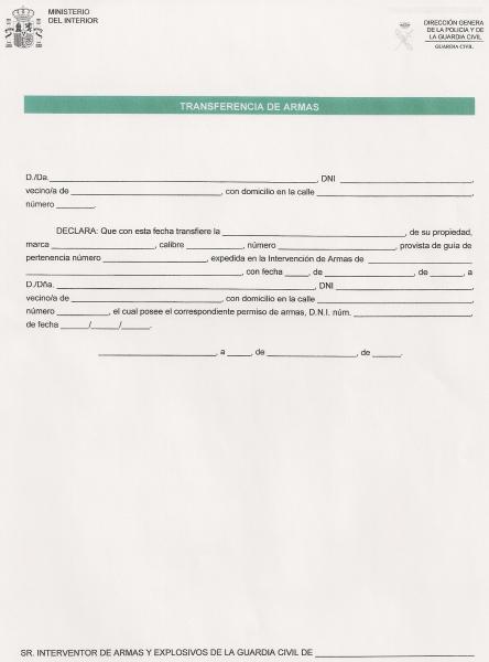 Estos documentos son de la G.C. y si los firman por ambas partes junto con con la Guia del arma las Licencias y los DNI ya tienen todo completo para hacer la transferencia del arma en la I.A. del comprador o del vendedor