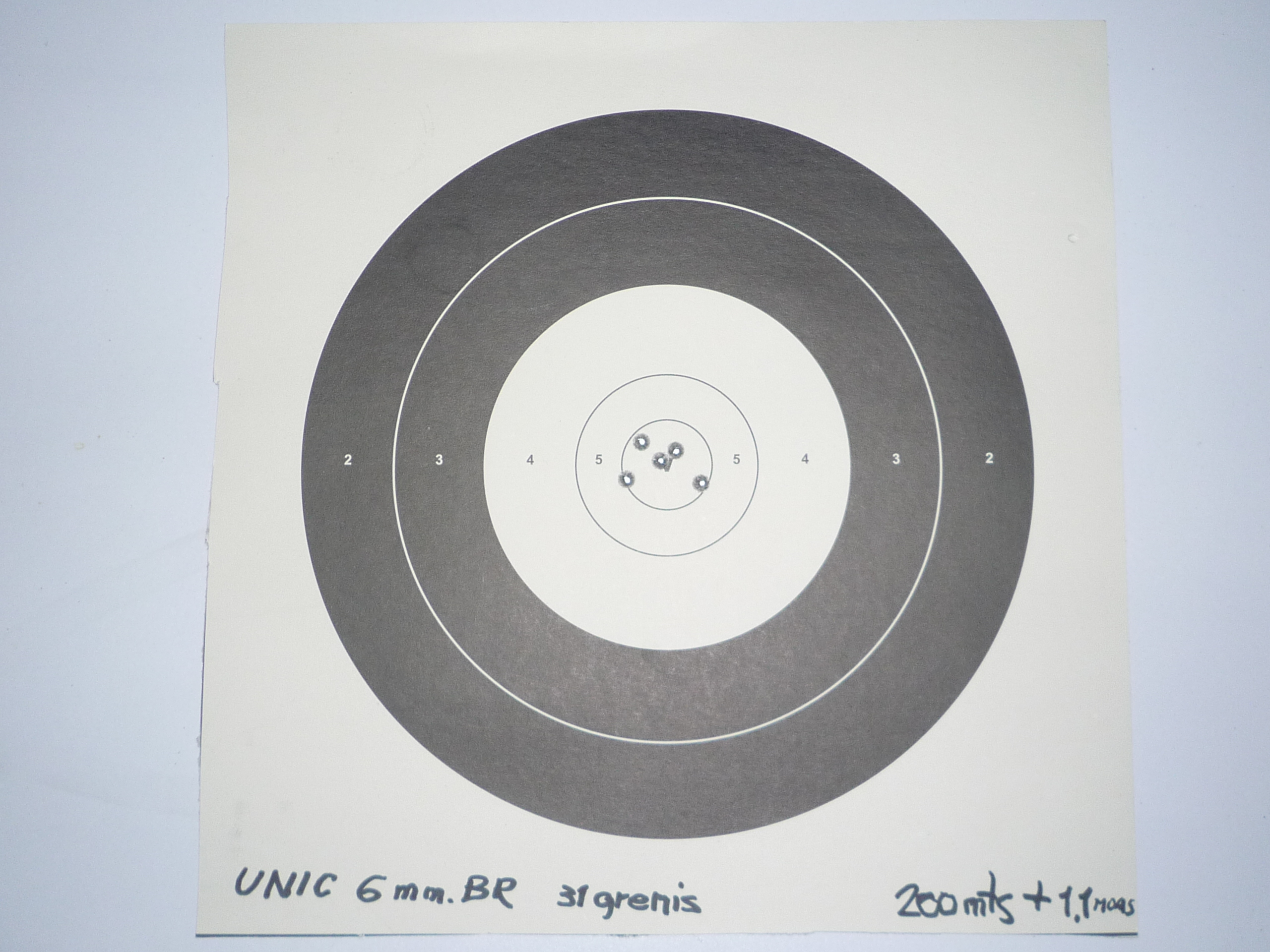 Pues yo tengo uno pero en calibre 6 mm. BR, y te puedo decir que es un máquina taladrando el papel y para constancia y placer en mostrártelo, te adjunto la ultima diana que tengo a 200 metros. en Torres del Segre.