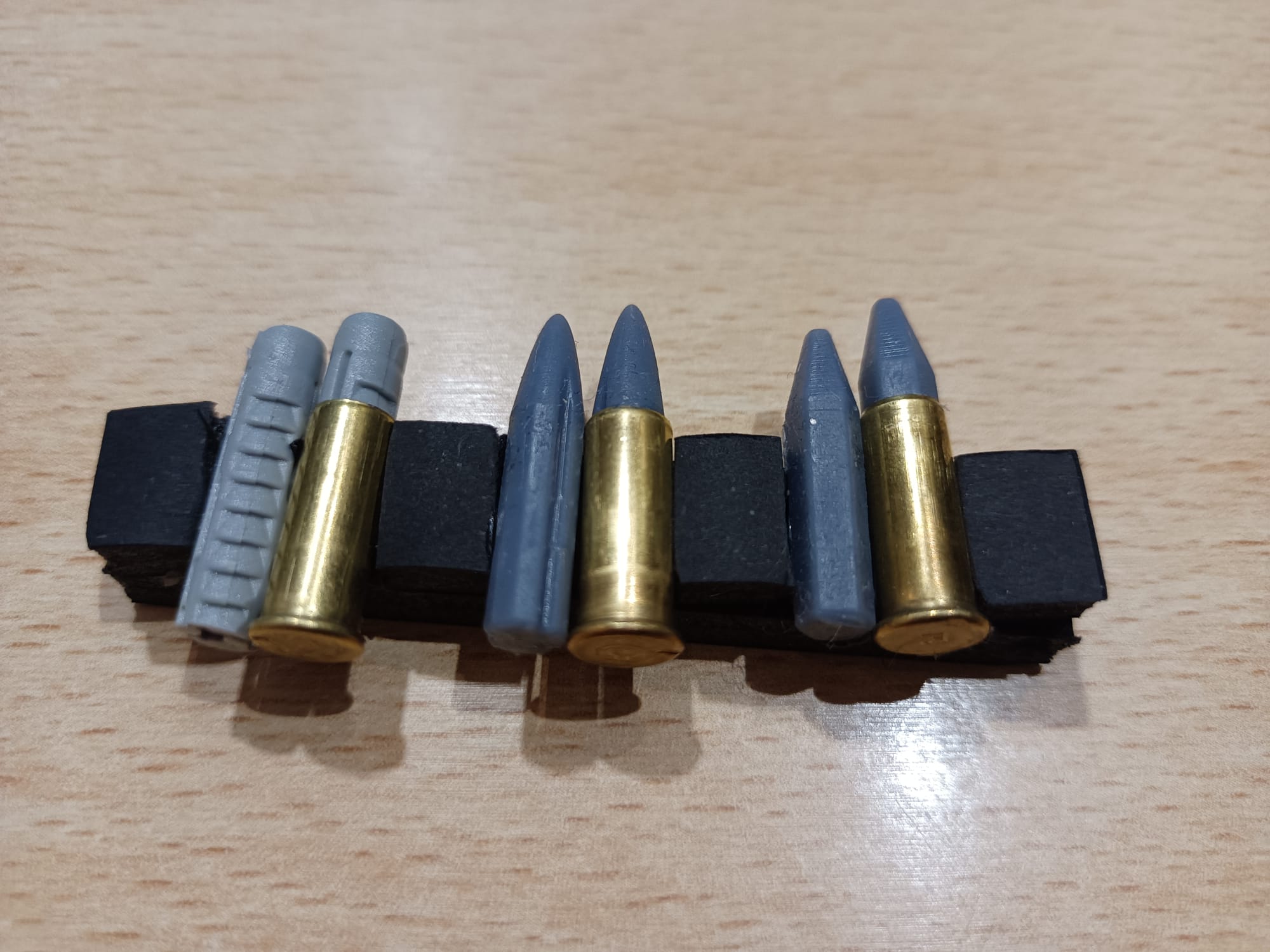 La foto es de lo que dejé para la colección, la ranura en el proyectil central es para que pueda salir el aire si es necesario, y lo mismo con el perfil hexagonal del último. La idea era pegarlos en la vaina con cola blanca (de carpintero), para poder sacarlos sin problema cuando llegue el momento, pero al mismo tiempo aguantaran las sacudidas de la alimentación si los mezclo con cartuchos reales en el cargador. Sin haberlos llegado a probar de forma satisfactoria, creo que no será necesario pegarlos.