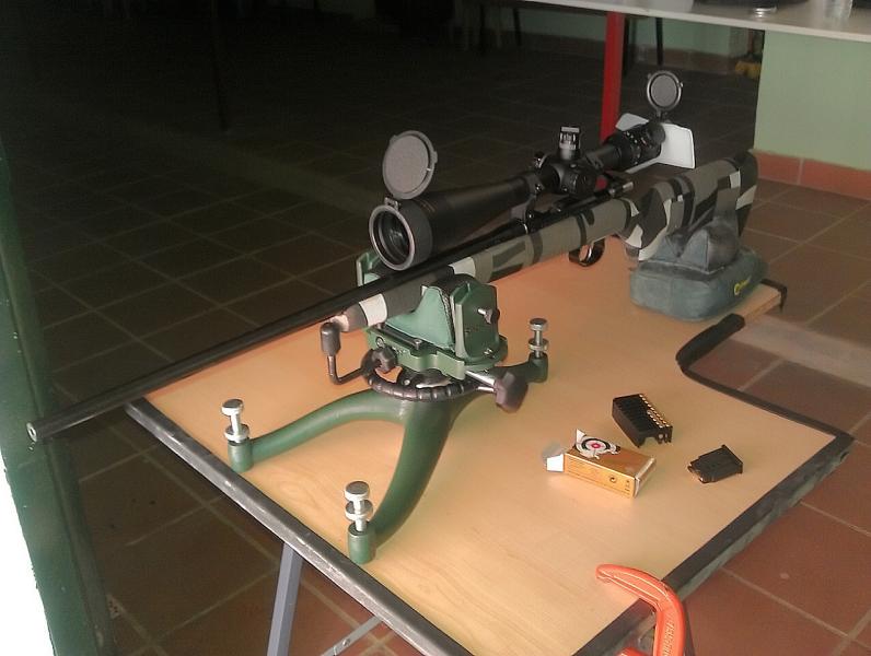 Torre artesanal que hizo mi compadre (padrino de mi hija) con restos de taller muy bien medidos y ensamblados. El saquete no es de competición sino uno universal, de esos negros que tienen forma de hueso cuando están vacíos. Por cierto, el tope del guardamanos es un trocito de una pulgada o así de goma de gas. Tiene corrección en altura y deriva, eso sí, pero sólo uso la primera y porque cada mesa te lo exige. El gran GGG le llama "el sputnik". Bueno, pues con esa torre he tirado años en BR-50 y Miras Abiertas, tanto con el CG como con la 452) con resultados.