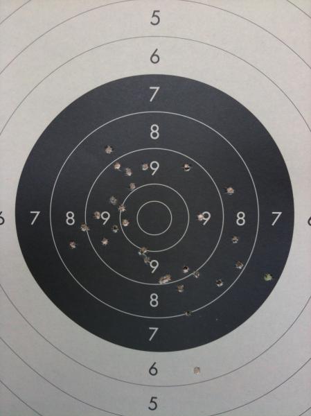 No soy un experto en miras abiertas, vaya por delante, pero tu diana muestra errores de altura y de deriva. Veo o creo ver dos grupos definidos en tu diana, uno en el segundo cuadrante y otro en el cuarto. Eso ocurre porque unas veces apuntas a un sitio y otras a otro. ¿Por qué pasa esto?, las más de las veces porque no se tienen las "luces" adecuadas a nuestra visión personal en las miras abiertas, las menos porque no te das cuenta.