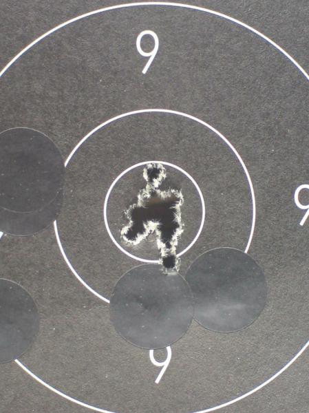 Pongo una imagen de una diana del primer día que tiré con visor en mi carabina. Unos 20-25 disparos a 20X, con bípode y sin apoyo trasero (con la culata apoyada sobre el puño cerrado) ya que dejé olvidado en casa el saquete. La diana es una "reciclada" de pistola.