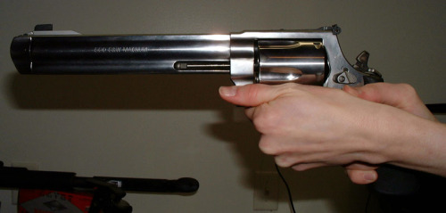 Agarrar un revolver con ambas manos y hacer un agarre como si fuera una pistola (pulgares extendidos hacia el frente), es algo que no se debe hacer nunca con un revolver porque los gases del espacio cilindro/cañon te pueden quemar ó literalmente cortar el dedo.