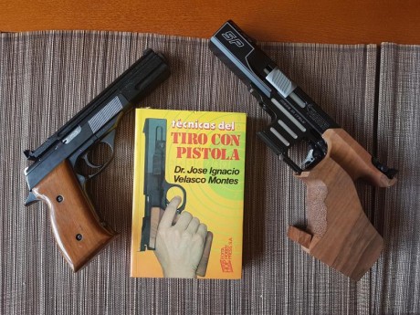 Un libro español, que casi me aprendí de memoria cuando empecé en el tiro con 18 años. Junto a él la pistola que usaba para estándar por entonces, y la que uso ahora