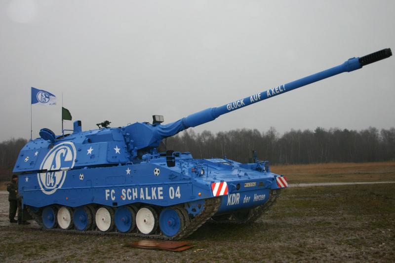 Y digo yo, si los alemanes se pueden permitir el lujazo de pintar un PzH 2000 con los colores del equipo de fútbol Schalke 04 porque no pinta el ejercito nuestro, un Leopard 2A6 con los colores de mi Real Madrid?.