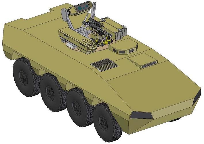 8x8 con torre controlada a distancia, con misiles anticarro y antiaéreos, ademas de una gatling...