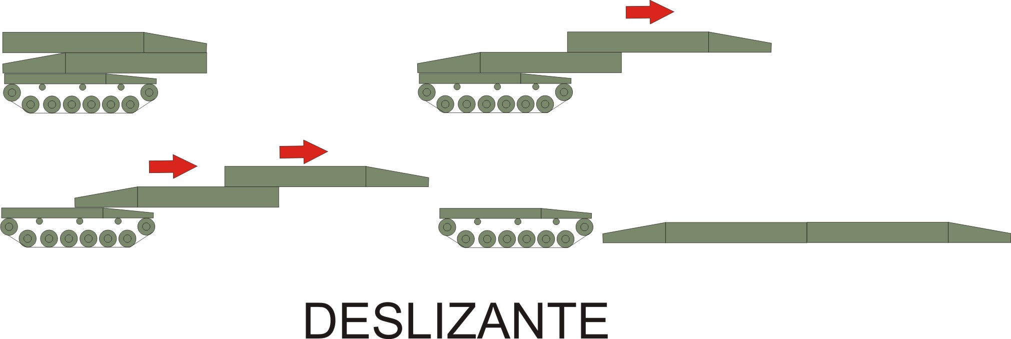 El cuarto sistema es el deslizante de tijera, muy usado por los rusos y sus socios y en algunas versiones de los aliados en la 2ª G.M. En este caso, primero se abaten las “punteras” del puente y posteriormente, el carro desliza el puente hasta posarlo sobre el terreno.