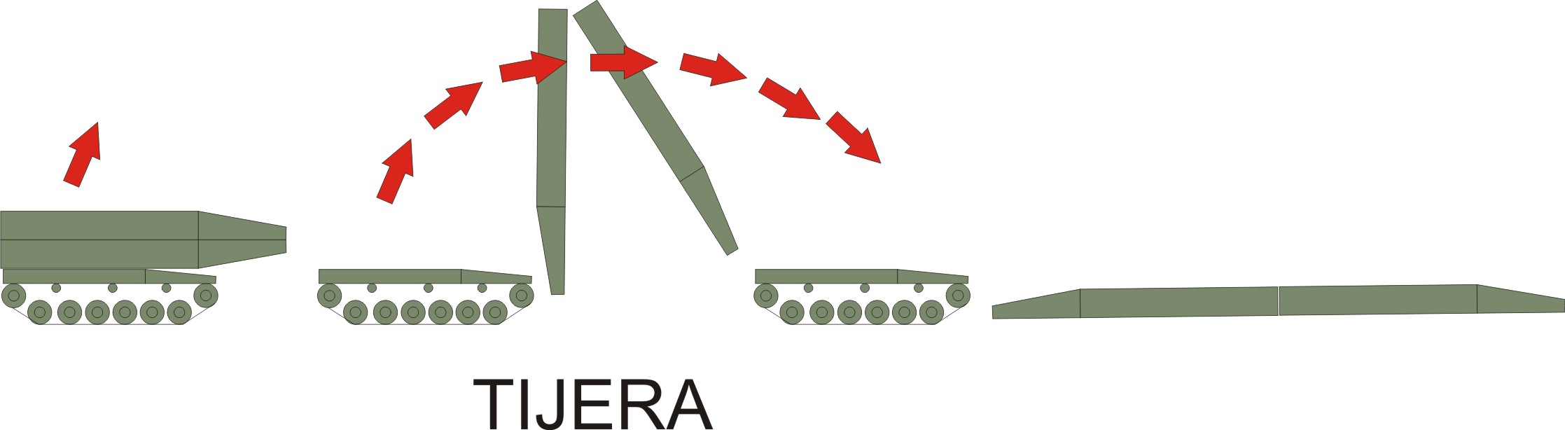 El primer sistema denominado de tijera, es el más común en la actualidad. En este caso, el puente está formado por dos elementos plegados de tal manera, que al abrirse y montarse sobre el terreno forma un puente compacto. El despliegue como se ve en la ilustración, tiene una primera fase de elevación en la cual, el vehículo portador apoya su morro sobre una especie de plataforma que evita que cabecee hacia delante. Los dos elementos que forman el puente se van elevando en forma de tijera hasta la vertical y el elemento superior se va abriendo hasta quedar totalmente en línea con el inferior, hasta que el brazo hidráulico lo deposita sobre el terreno.