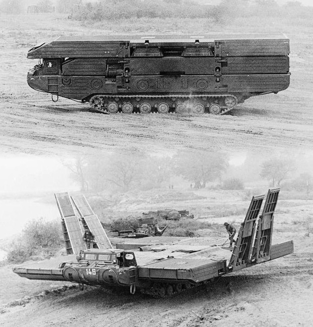 Creo recordar que había también un tipo de carro (me suena haber visto fotos de unidades alemanas de la IIGM y rusas de los 70) que se metía el carro en el cauce y desplegaba un tramo de puente hacia adelante y otro hacia atrás, quedando el propio carro en el medio del río, acutando como "pilar intermedio". Claro que esto sólo se podría hacer determinados sitios, pero la longitud de puente largada era impresionante.