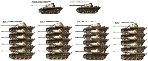Os pongo la composición de una compañía alemana con Phanter y la USA con Sherman. La americana solia llevar en el pelotón de mando un Sherman con obús de 105 mm.