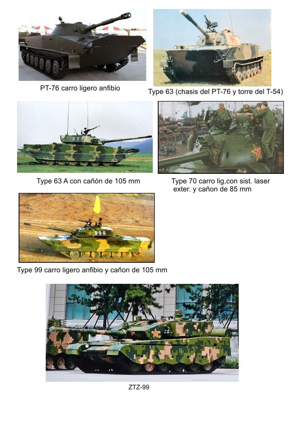 Esto es lo referente a los medios, en cuanto a los ligeros, China cuenta con el Type 62 versión mejorada del Type 59 con cañon de 85 mm., el Type 63 A (chasis del PT-76 y torre del T-54), el Type 63 carro ligero anfibio - es un Type 60 mejorado con torre de T-62 -, con cañón de 105 mm, el Type 70 con sistema laser de puntería y cañón de 85 mm., y finalmente el Type 99 carro ligero anfibio y cañón de 105 mm, y como no el veterano PT-76 aunque este lo tengo encuadrado en dos sitios, como carro ligero anfibio y en VCI, vehículo de combate de infantería.