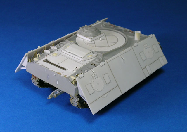 como veis un M50....todo lo que veis, en barcaza de color distinto al gris claro del plástico (excepto los protectores de los faros), son una transformación para convertir un sherman WWII en uno israelí...bueno, los guardabarros son propios también de los HVSS..