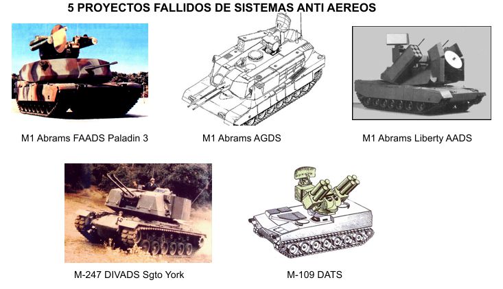 Como defensa antiaérea aparte del M-247 DIVADS Sgto York que al final se anulo por ser un desastre, además quisieron desarrollar otras dos variantes antiaéreas basadas en el chasis del M1 Abrams, el M1 Abrams GDS con dos cañones Bushmaster 3 de 35 mm y 12 misiles AIM-140 del sistema ADATS y el M-1 Abrams Lyberty AADS equipado con dos cañones de 25 mm y 12 misiles AIM-140 ADATS. Los dos anulados, acabando en museos. Por lo tanto, ni un solo sistema antiaéreo sobre cadenas, tan solo fue el M 727 Hawk sobre chasis del TOA de carga M 548 que se dio de baja en los 80 y el FAADS M975 Roland 2 (chasis de ATP M109), que igualmente se dio de baja por esas fechas. El único misil sobre cadenas fue el Phersing, tanto el misil como los cuatro vehículos que formaban el equipo de tiro, el que llevaba separada la cabeza de combate, el portador del misil y la dirección de tiro y el puesto de mando (IMAGEN).
