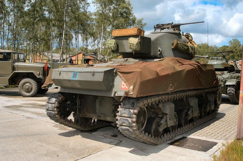 este, si muy bien conservado, presenta un error importante...esas cadenas y ruedas propulsoras solo se usaron en sherman britanicos...y lo han pintado como americano....este carro sale en la serie "hermanos de sangre"...tanto de americano como de britanico...