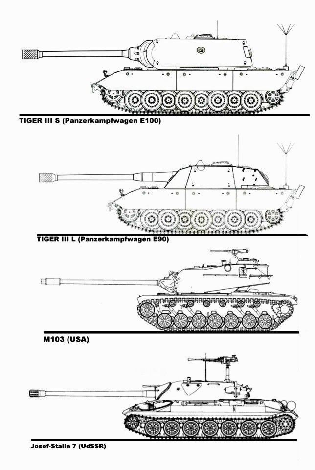 Pues si, esta claro que (como ocurrió en la realidad), el prefeccionamiento de las cargas huecas acabaría haciendo inútiles estos modelos superpesados, y los alemanes evolucionarían hacia un carro medio. En este diagrama se comparan los "pesados" de la época: