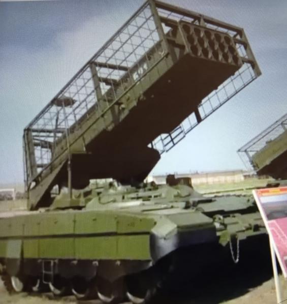 Es el terrible vehículo MLRS Tos Buratino ruso, en este caso la versión TOS 3 Dragon. A esta versión se le ha montado 15 cohetes de 220 mm, a diferencia de la versión TOS 1, en el sistema original la denominación era Ob.634 o la de TOS-1M que 30 cohetes y mas tarde la versión Ob.634B o TOS-1A con 24 proyectiles, ambas sobre chasis de T-72, en este caso es un chasis de T-90 y la jaula protectora, ya es de fabrica.