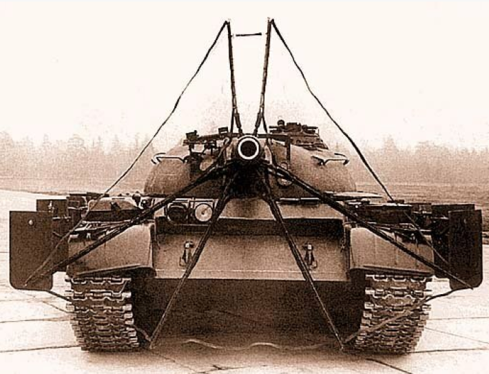 Buenas tardes. La respuesta a ese extraño sistema colocado en el cañón de ese carro ruso, es lo que se conocía como "el paraguas". Era como bien dice el nombre un artificio en forma de paraguas que en lugar de tela llevaba como una malla metálica. Este artilugio al mismo tiempo actuaba conjuntamente con las placas laterales que veis a la altura del tren de rodaje, que se abrían hacia delante protegiéndolo de los disparos perforantes. Cuando no se utilizaba "el paraguas" se recogía a lo largo del tubo del cañón.