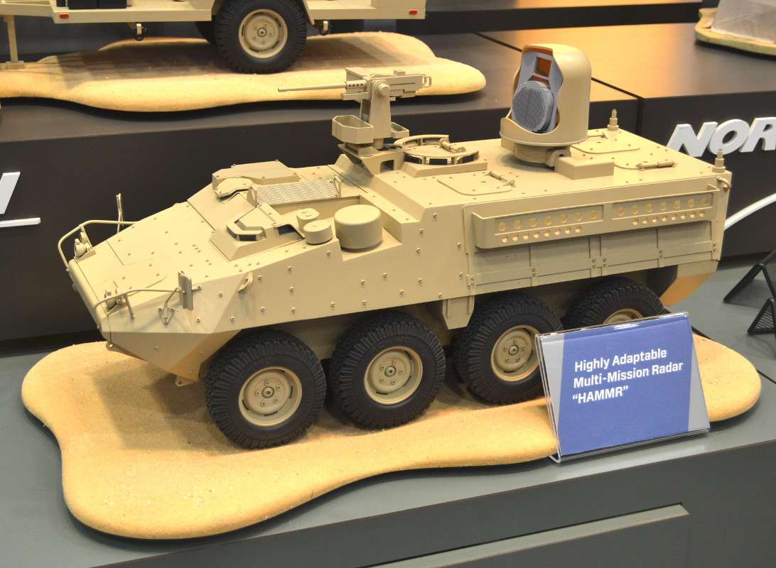 "Northrop Grumman also put out a model of a Styrker equipped with its active electronically scanned array Highly Adaptable Multi-Mission Radar (HAMMR). The company is working with the Army on this radar as a complementary sensor for various short range air defense weapons and has depicted it installed on a Humvee, as well."