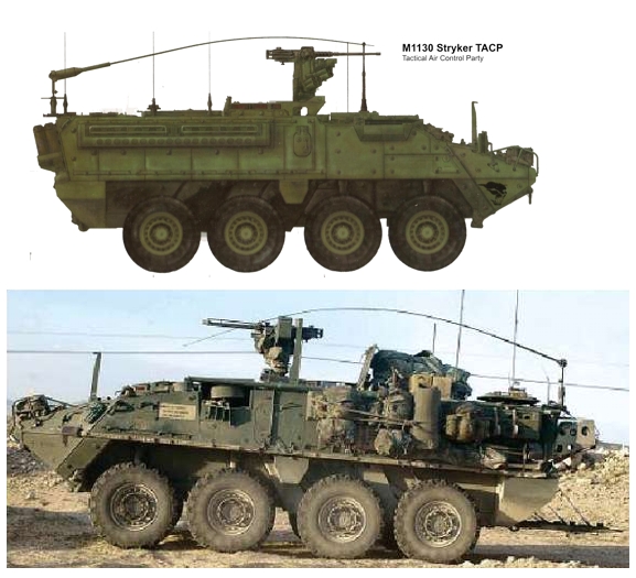 El Stryker M1130 TACP o Tactical Air Control Party. Vehículo VARIANTE del VC para el control aéreo y dirección del apoyo de fuegos de la aviación