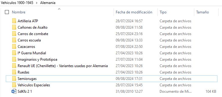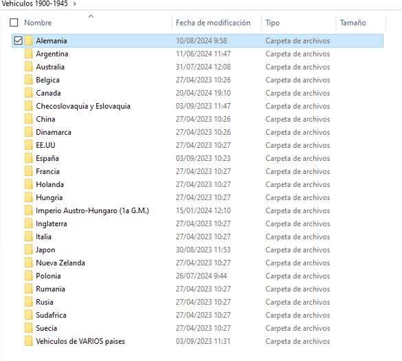 Entramos por ejemplo en la carpeta vehículos 1900-1945. Aquí tengo variantes de vehículos anteriores a 1.900 al ser desarrollos de los primeros vehículos blindados, pero no mas de 10 años de anterioridad.