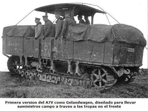 La otra versione es el Carro de suministros A7V Gelandwagen que es una version con capacidad de carga de unas 7 tm y podia transportar hasta 30 hombres.
