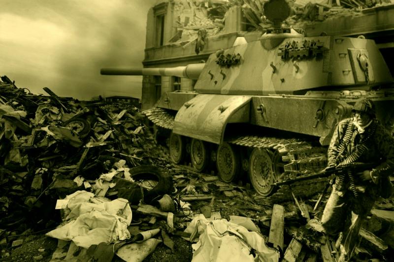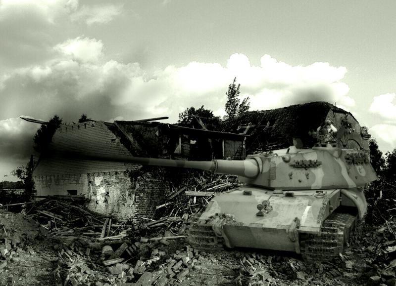 Un Tiger IIIL en acción entre las ruinas de un pueblo Polaco