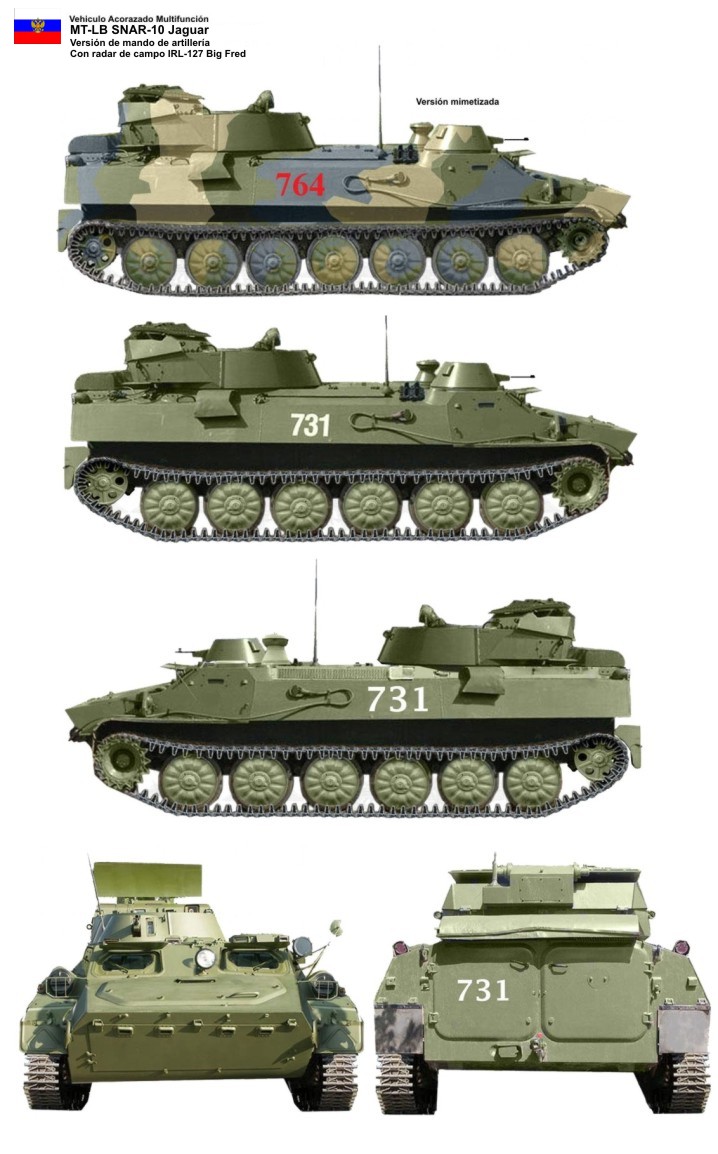 SNAR-10 "Jaguar" (Stantsiya nazemnoy artilleriskoy Razvedki) - con un radar 1RL-127 ("BIG FRED") para localización de artillería / mortero montado en una torreta giratoria. Alcance: 16 km. Antiguo designacion de la OTAN MT-LB M1975 y SON MT-LB.