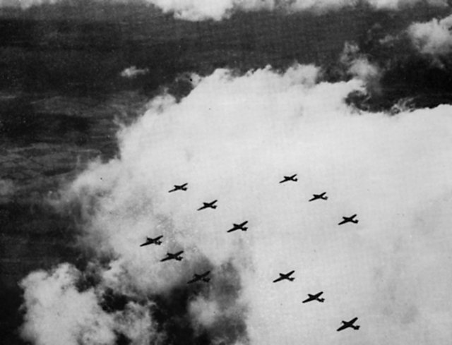 esto me recuerda a los Cazas. I si no, que pregunten a los ingleses en la Batalla de Inglaterra. Sus formaciones "VIC" o "V" de 3 cazas fueron un desastre.