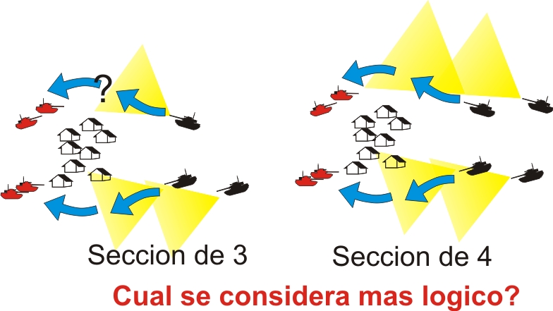 Pongo un ejemplo. Supongamos un objetivo X, el que sea (pongo dibujo). Si tres carros quieren hacer un ataque envolvente, que hacen dos carros por la izquierda y uno por la derecha? Y si no sabemos si existen enemigos en ese flanco izquierdo, que se hace, se le manda solo?. No es más lógico, que fueran dos y dos, y se apoyaran en esa regla básica del binomio del mutuo apoyo?. De ahí de que no me explico que haya ejércitos que emplean las secciones de tres.