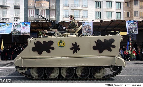 Uno, es la versión iraní del M-113 denominado M113 A1 Sayyad equipado con una ametralladora DShK de 12.7 mm. Por cierto un camuflaje ridículo donde los haya, parece que le hayan tirado botes de pintura.