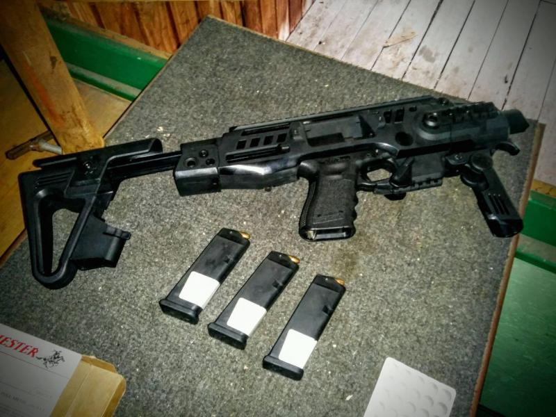 Que en realidad no es mas que una de nuestras glock19 con ese traje nuevo que podeis ver, es la primera vez que pruebo un chisme de estos, y he de decir que me gusto, el encare es mucho mejor, mas comodo, y seguro que la precision aumenta de forma notable. Esto no pude comprobarlo puesto que como veis aun no tiene visor, asi que lo que hice fue tirar al bulto, por tirar. La sensacion me gusto bastante, supongo quela proxima vez que vaya seguro que le han puesto algo ypuedo hacer algunas pruebas y os cuento.